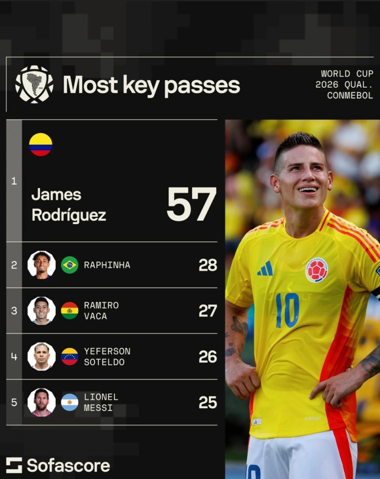 本届南美世预赛关键传球榜:J罗57次断层居首,梅西25次第五