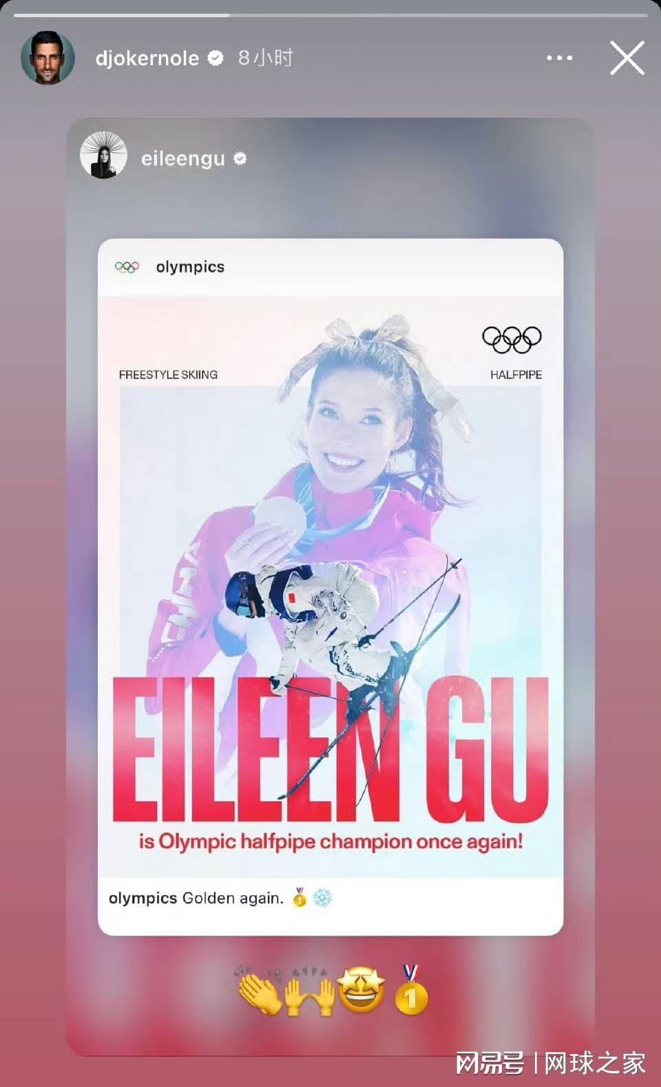 谷爱凌夺金后,社交媒体上瞬间被祝福声淹没。最引人注目的莫过于网坛天王德约科维奇的亲自下场。这位手握24个大满贯冠军的传奇人物在Instagram上转发了谷爱凌的夺金海报,并配文送上诚挚祝贺。有网友调侃:“这是GOAT(历史最佳)之间的惺惺相惜。”
